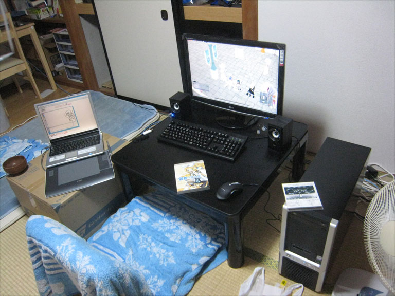 デスクトップPC本体の上にあるケースは和太鼓の曲のCD、左のノートPCの画面に映っているのは絵チャット。