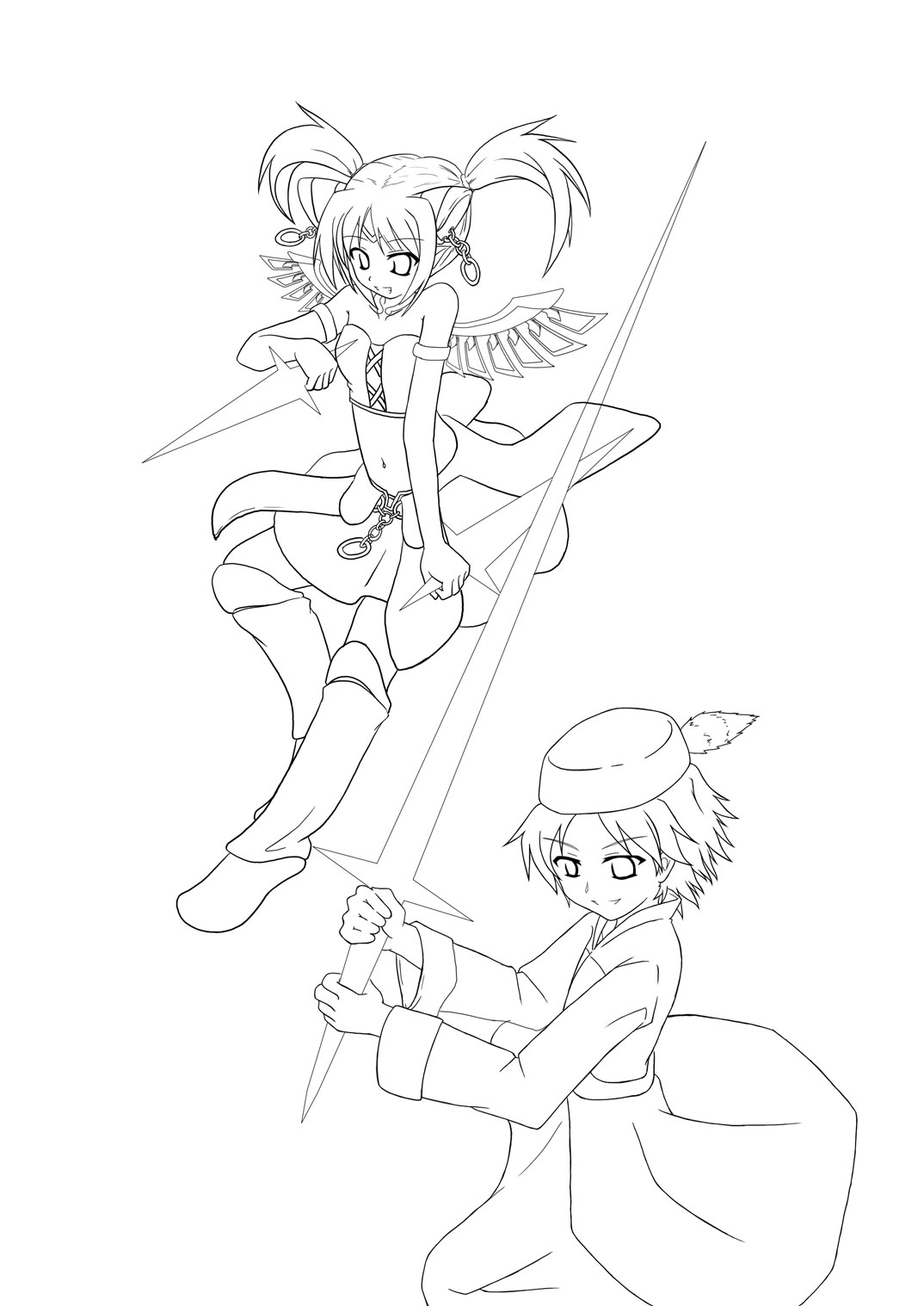 剣は魔力の塊みたいなもので最終的に光らせるので、線画の段階ではシルエットだけ描いてます。